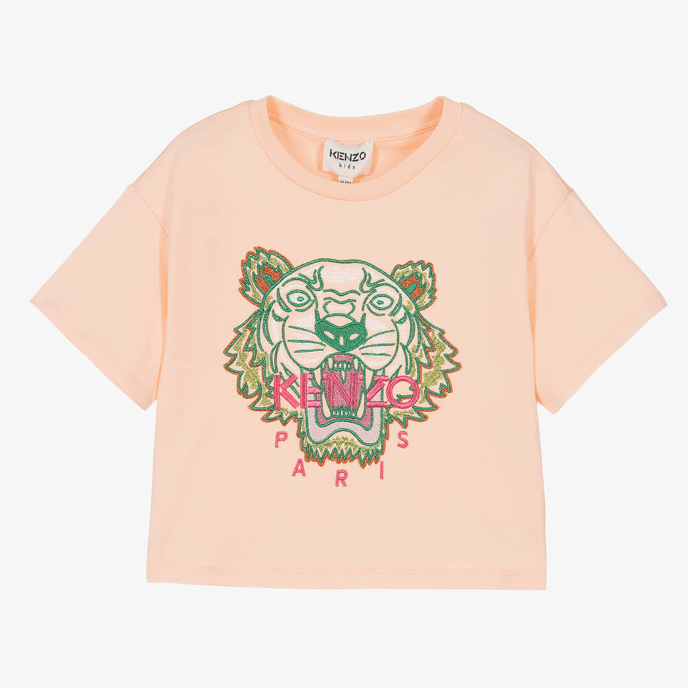 Orange-pink T-shirt for girls by KENZO KIDS, made in lightweight organic cotton jersey. Boxy with a casual crew neck, it has the iconic Tiger logo embroidered on the front in tones of dark pink, green and bronze with an eye-catching, glittery finish.