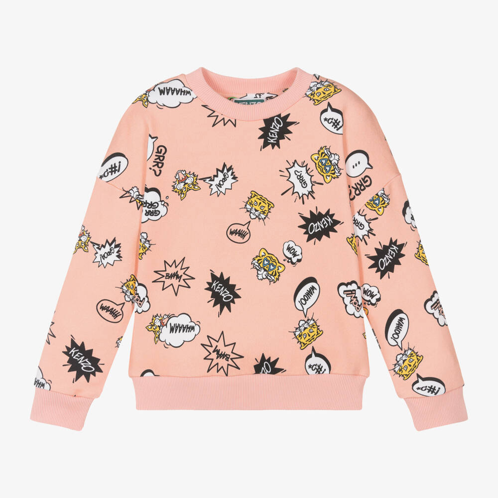 Fun pink long-sleeved sweatshirt for girls by KENZO KIDS, made in soft cotton jersey. Adding a graphic twist to casualwear, this crew neck sweatshirt has playful tiger graphics with cartoon, comic-inspired speech bubbles. Stretchy ribbed trims on the neckline, the cuffs and the hem complete the style with comfort.