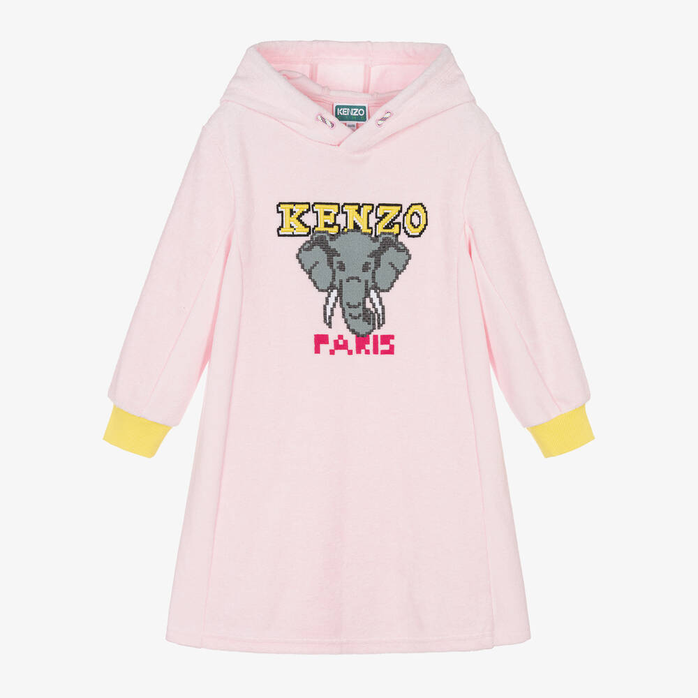 Light pink hooded dress for girls by KENZO KIDS, made in soft, mid-weight jersey. Forming part of the brand's Jungle Game collection, this distinctive piece has a bright yellow and pink Kenzo Paris logo embroidered to look three-dimensional, together with a pixelated Elephant motif. A comfortable choice for casual days, it has a hooded neckline, lightly ribbed trims and terry towelling panels on the side of the body.