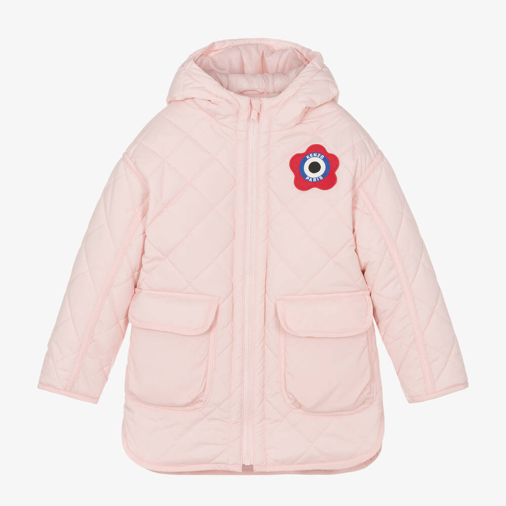 Hooded pale pink coat for girls by KENZO KIDS, ideal for cooler days. Lightly padded for warmth and made with a water repellent coating, it has a stylish, quilted effect, oversized pockets on the front and a smooth zip fastening. The pop-art-inspired KENZO Target logo adds a colourful touch to the front, and it has a statement K Flower logo appliqué on the back.