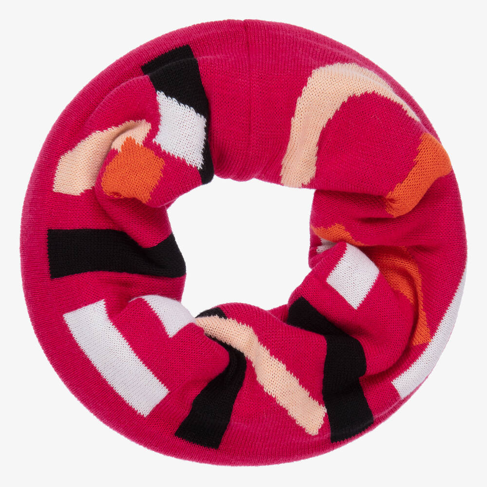 Fuchsia pink snood for girls by KENZO KIDS, knitted in a blend of soft polyester, cotton and wool. Warm and cosy, this double layer snood has a colourful intarsia logo all the way around.