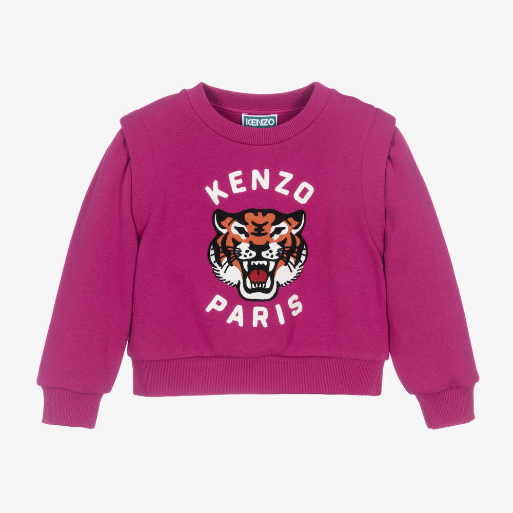 Girls magenta pink sweatshirt by KENZO KIDS, made in a mid-weight cotton jersey blend with a fleecy inside. This Lucky Tiger top has the Kenzo Paris logo on the front in white, chain stitch embroidery. It has gently gathered sleeves and layered shoulders for a structured silhouette.