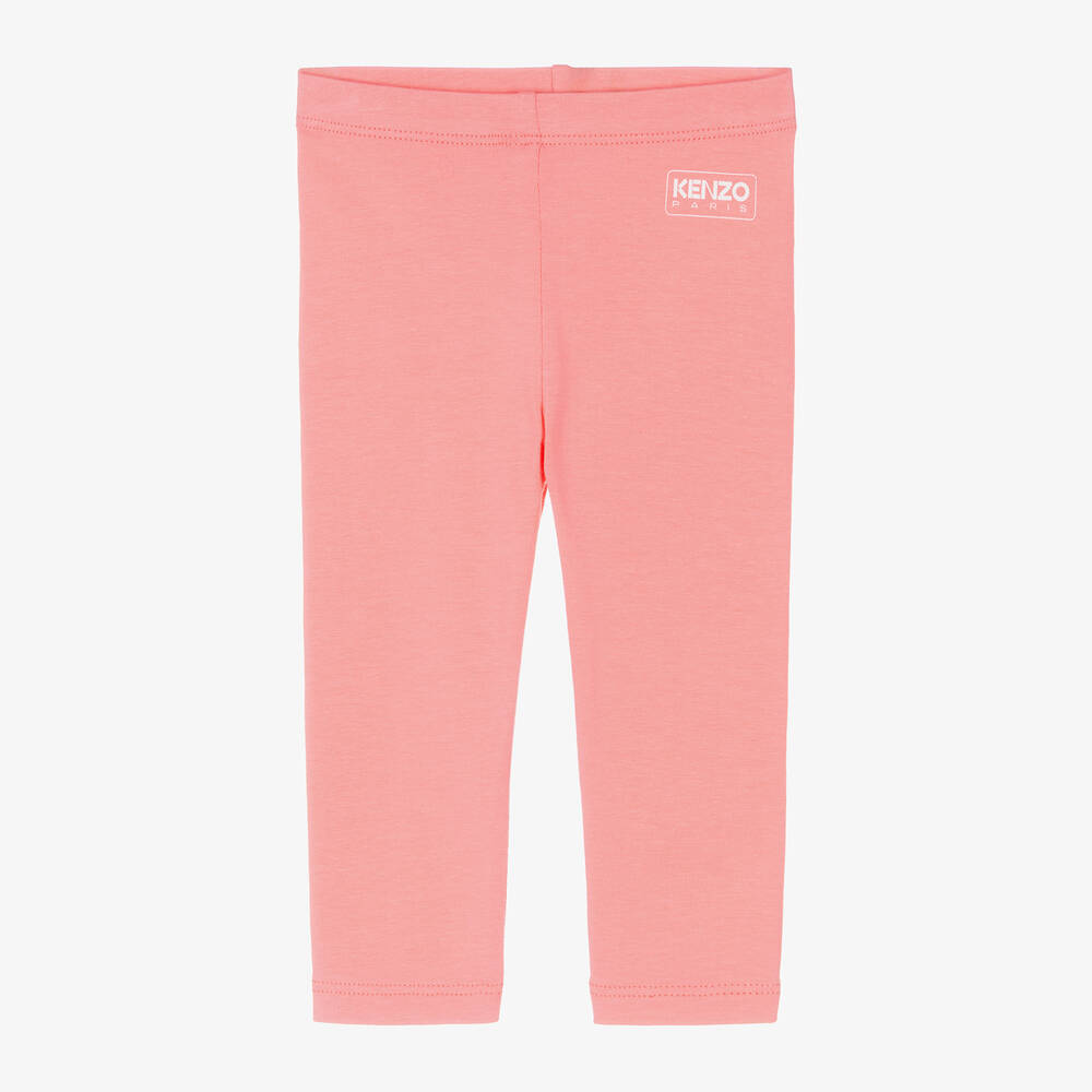 Coral pink leggings for little girls by KENZO KIDS, made in soft and stretchy organic cotton jersey. Easy wearing, these casual leggings have a white logo print on the front and a comfortable elasticated waistband.