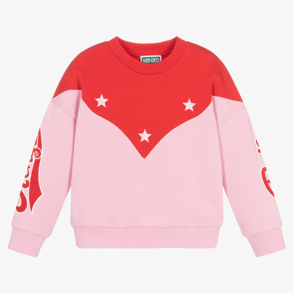 Pink and red cotton sweatshirt for girls from KENZO KIDS, made in soft mid-weight jersey. In a casual style, this comfortable top has a ribbed neckline and embroidered star motifs on the front and back. Signature logos are embroidered on the dropped sleeves for a distinct designer look.