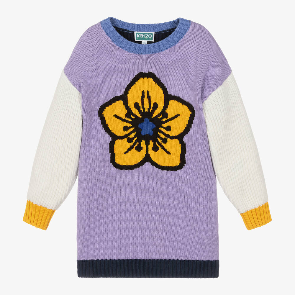 A striking long-sleeved sweater dress for girls by KENZO KIDS, knitted with a blend of cotton, viscose, and wool. In a cool colourblock design, the lilac purple front panel has a contrasting mid-blue neckline and a bold mustard yellow jacquard flower motif for a distinct look. The ivory dropped-shoulder sleeves have coordinating yellow cuffs and the navy blue back panel is stitched with a logo patch for a branded finish.