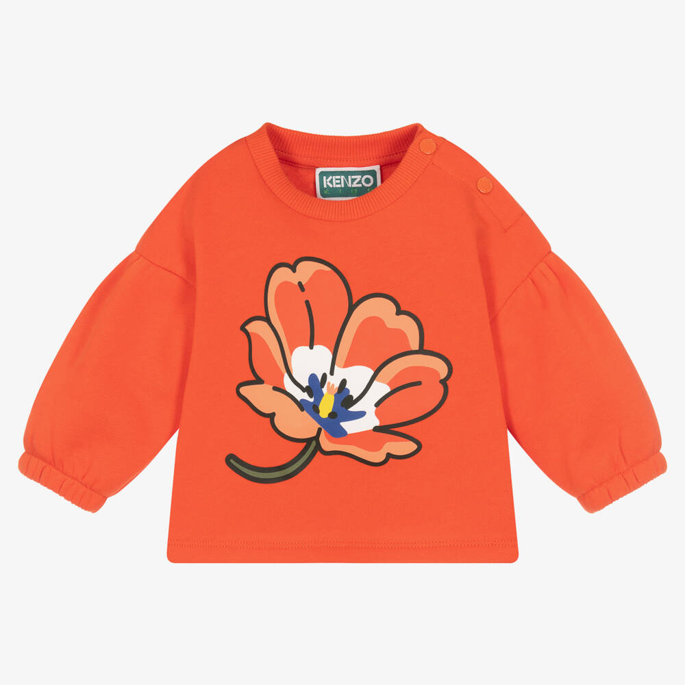 An orange-red sweatshirt for little girls by KENZO KIDS, made from super soft cotton jersey. Fun and comfortable to wear, the brand's signature cartoon-effect Boke Flower is printed on the front, with the classic Kenzo Paris logo on the back. This casual top is finished with elasticated puff sleeves, and has logo-embossed poppers on one shoulder for easy dressing.