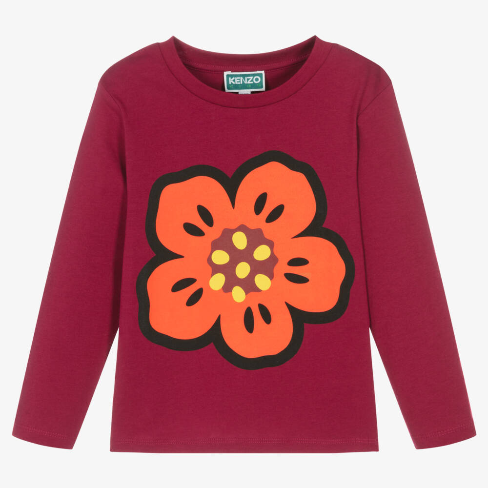 A dark berry red organic cotton top for girls by KENZO KIDS, made in super soft cotton jersey with long sleeves. Inspired by the brand's Japanese heritage, a bold Boke Flower is printed on the front. There is a black Kenzo Paris logo graphic on the back to finish the look.