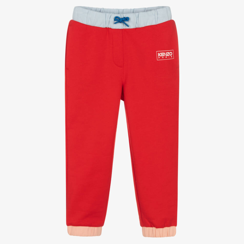 Designed by KENZO KIDS, these vibrant red cotton jersey joggers are lovely and comfortable for girls. For cool splashes of colour, they have a pale blue waist with royal blue drawstrings, coral pink cuffs and a bright yellow patch pocket on the back. The label's white box logo is printed on the front for a stand-out branded look. They have useful side pockets and an easy elasticated waistband.