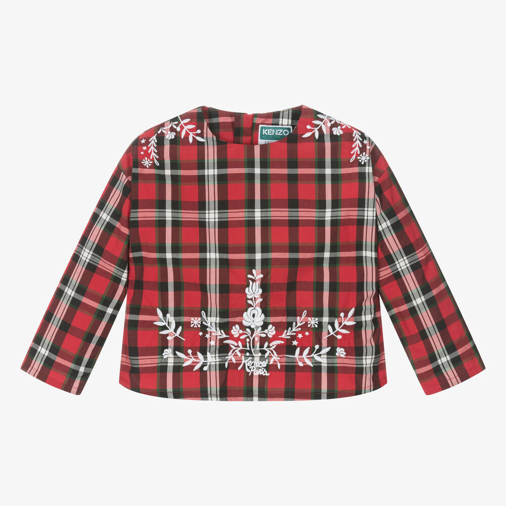 Red and green tartan check blouse for girls by KENZO KIDS, made in cotton poplin. A classic look, it is simply styled with a round neck and a concealed zip fastening on the back. For a festive touch, beautiful white Scandinavian-style embroidery can be seen on the shoulders and on the front hem, including the designer's logo.