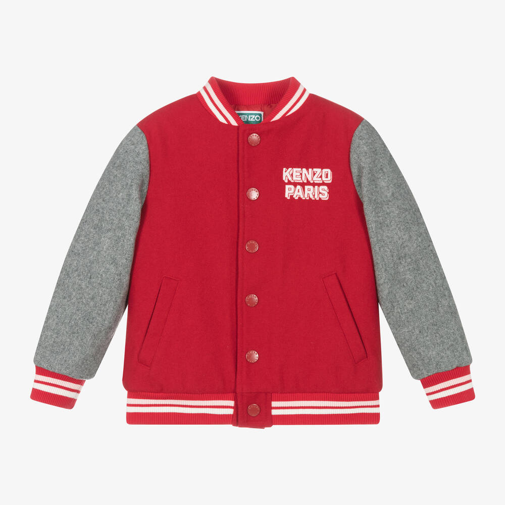 Collegiate-inspired red and grey varsity jacket for girls by KENZO KIDS. Made in a soft wool blend, this cool bomber style has sporty stripes and an embroidered logo on the chest. It fastens with poppers on the front and has a silky lining and front pockets. For a standout look, there are Boke Flower appliqués on the elbows and an oversized K Flower motif on the back.