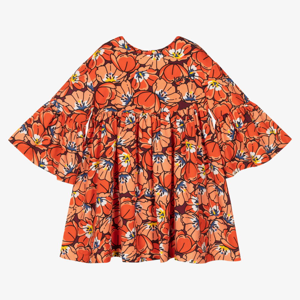 An orange-red dress for girls by KENZO KIDS, patterned with the brand's vibrant cartoon flowers design and with the signature Kenzo Paris logo embroidered on the chest in black. Beautifully soft and comfortable, it is woven in soft, lightweight lyocell, with feminine bell sleeves. There is a neat, concealed zip fastening on the back and a silky viscose lining for added comfort.