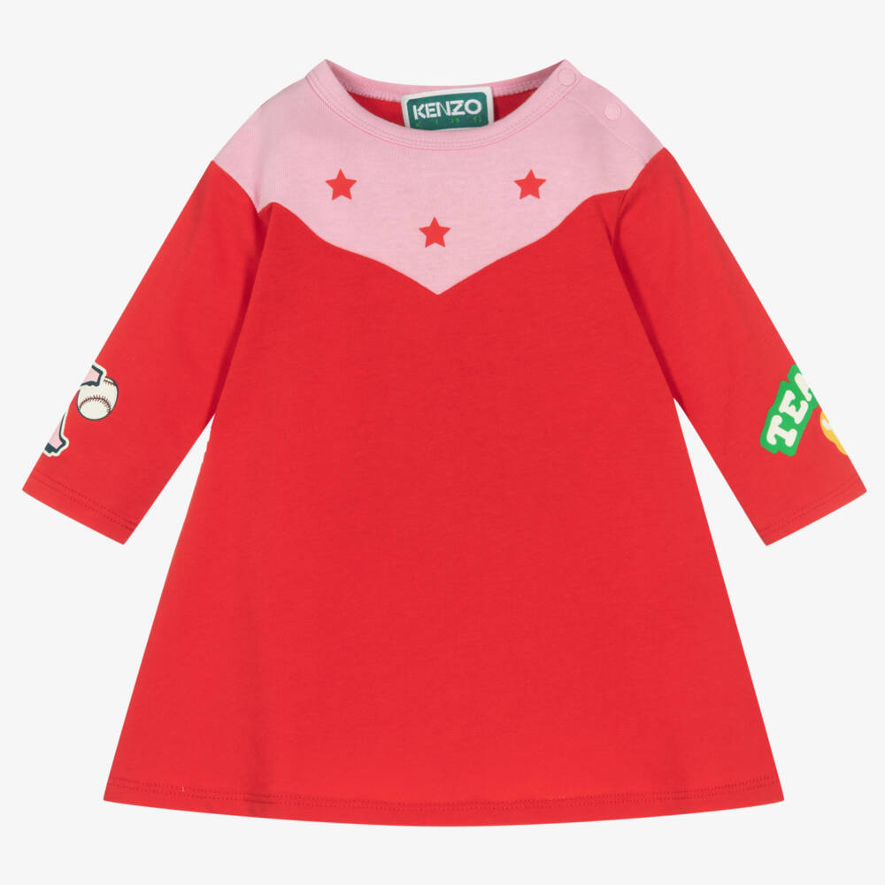 Red and pink dress for little girls by KENZO KIDS, made in soft, mid-weight cotton jersey. With three red stars on the chest, this comfortable piece has a varsity-inspired logo print on one sleeve and the brand's iconic 'K' motif on the other. A signature logo print can be seen on the back of the neckline for further designer appeal. Branded popper fastenings on one shoulder make dressing simpler.