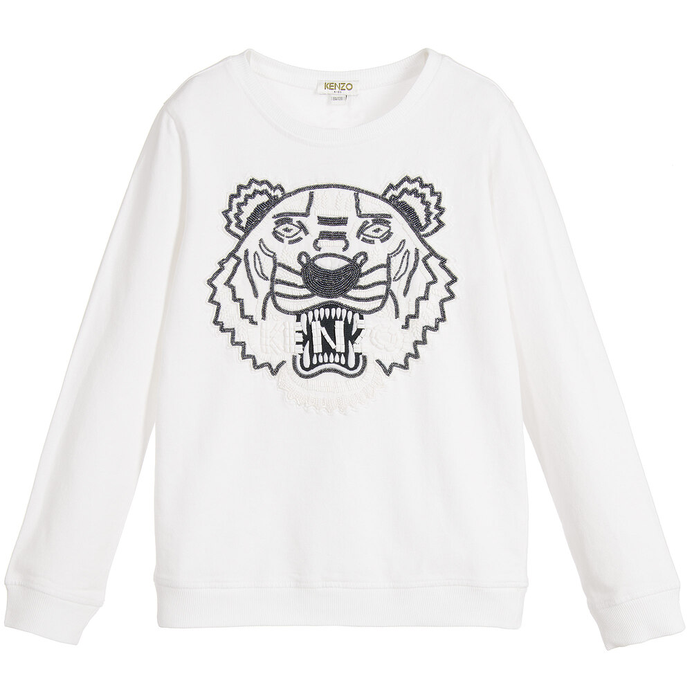 Girls white sweatshirt by Kenzo Kids, in the designer's 'Tiger Kiosque' theme, with a heavily embellished, beaded roaring tigers head on the front in grey and white with the designer's logo, inspired by the adult collection. It has a round, ribbed neck, cuffs and hemline.