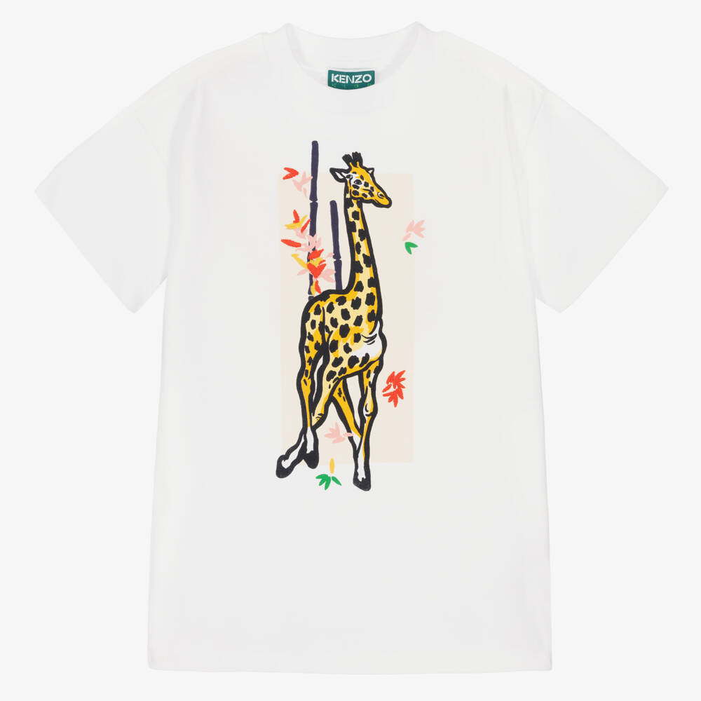 Cute white dress for girls by KENZO KIDS, in an easy to wear T-shirt style. Great for casual days, this organic cotton jersey dress has a bold giraffe print on the front with embroidered trims and a logo printed on the back.