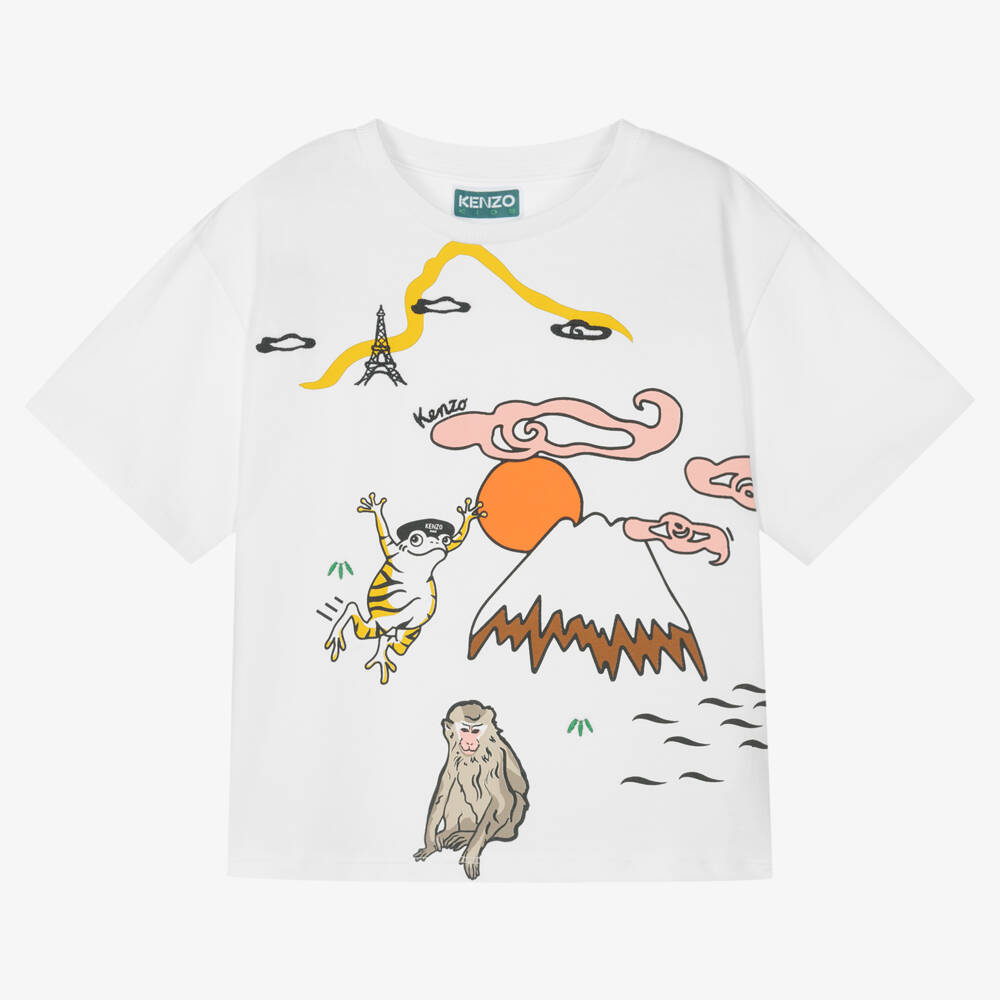 White T-shirt for girls by French designer KENZO KIDS, made in soft organic cotton jersey. In a relaxed boxy style, it has a colourful KOTORA map print on the front and back, featuring animal motifs, fun illustrations, and embroidered logo detailing.
