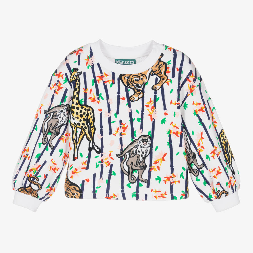 Girls white crew neck sweatshirt by KENZO KIDS, made in soft cotton jersey. Patterned with a quirky bamboo jungle print with monkeys, tigers and giraffes, this boxy fit sweatshirt has an orange logo print on the back for a logo-inspired look.