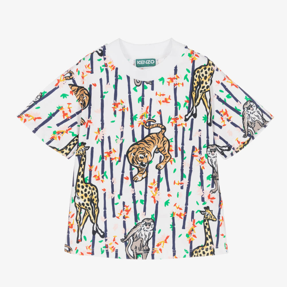 Fun white logo-inspired T-shirt for girls, by KENZO KIDS. Made in soft cotton jersey, it has a bamboo striped design with fun and colourful monkeys, tigers and giraffes. Instantly recognisable, it has the designer's logo printed on the back in orange for a branded finish.