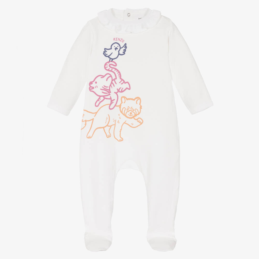 A lovely white organic cotton babygrow for girls by KENZO KIDS, with a pretty frilled collar. Made from soft jersey, it has a charming, pastel coloured baby animal design across the chest. There are branded popper fastenings on the back to help with changing.