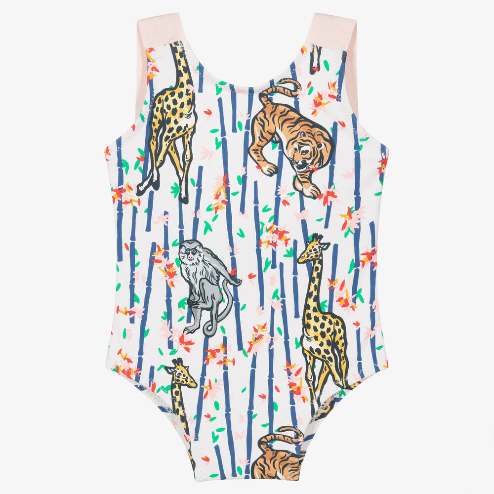 Cute white and pink swimsuit for little girls, by KENZO KIDS. Made in stretchy, lined lycra for comfort, it has a colourful bamboo print with adorable jungle animals. It has a sweet scoop neck and pink cross-over logo straps for a branded finish.