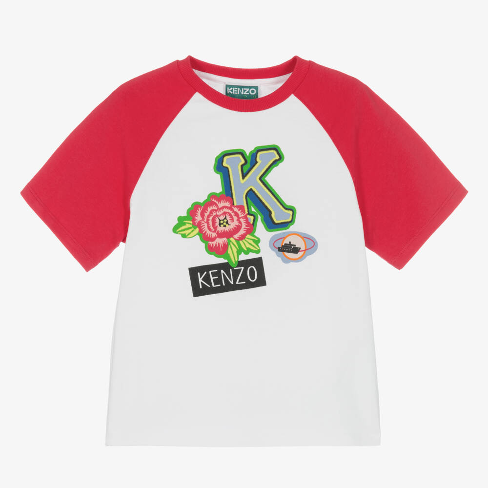 White and fuchsia pink organic cotton T-shirt for girls from KENZO KIDS. Soft, stretchy and comfortable, it has cool raglan sleeves for a sporty look and a rose and logo graphic on the front, with embroidered detailing.