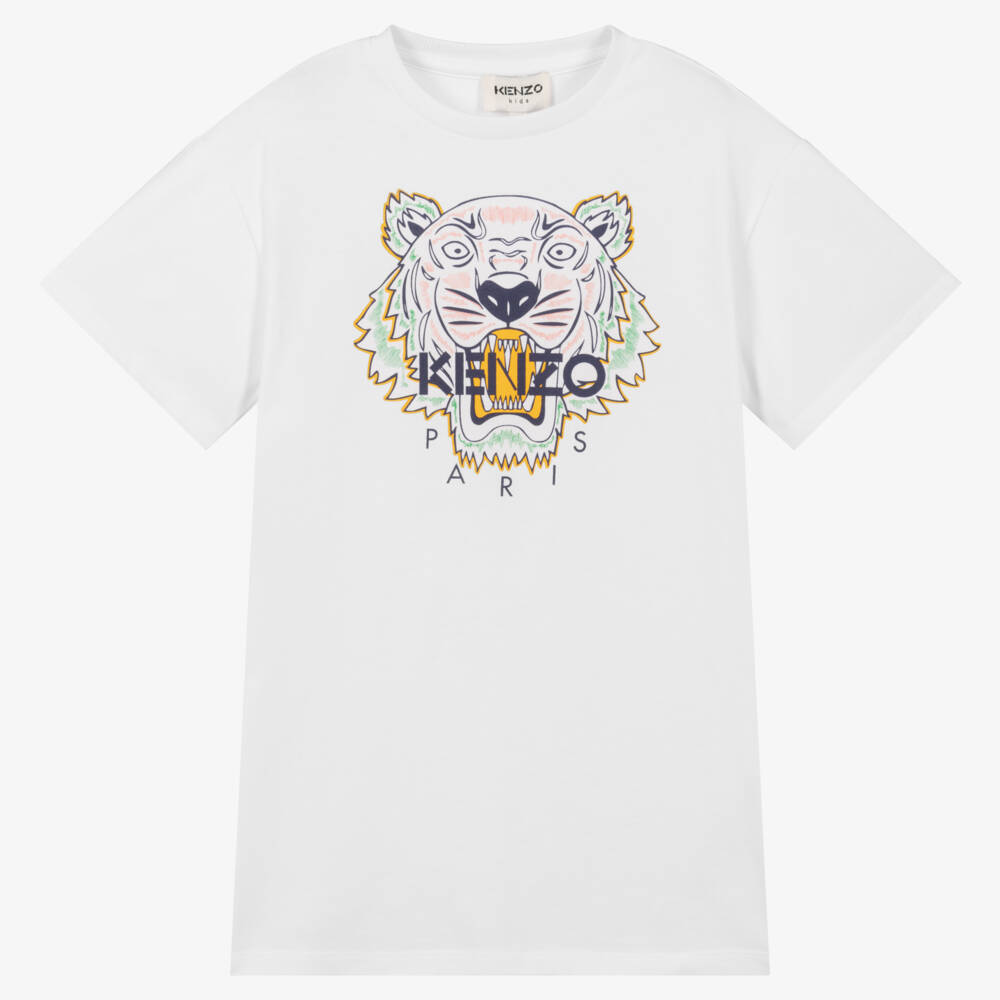 Stylish white dress for girls by KENZO KIDS, in the relaxed style of a T-shirt. Made in soft organic cotton jersey, it has the brand's instantly recognisable Tiger logo printed on the front and a casual ribbed neckline.