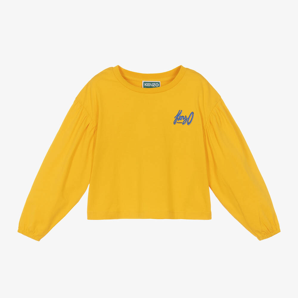 In a striking mustard yellow shade, this long-sleeved top for girls is by KENZO KIDS. There is a bold black and blue flower printed on the back and a coordinating logo motif on the chest for an instantly recognisable look. Made from soft organic cotton jersey, the dropped-shoulder sleeves have gathered detailing and stretchy cuffs.