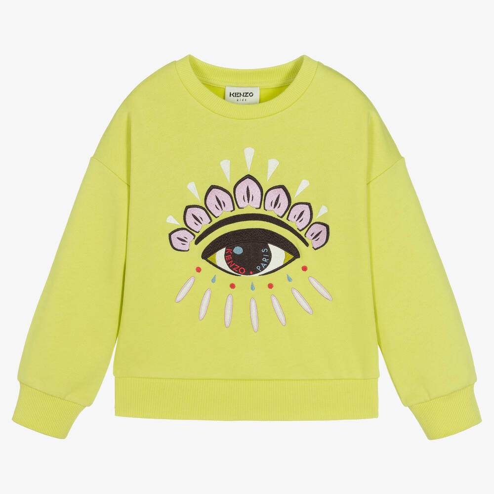 Yellow sweatshirt for girls by luxury French designer KENZO KIDS, with a pink and black embroidered Eye logo on the front and a Wink logo on the back. It is made in comfortable cotton jersey with a fleecy inside and ribbed trims.