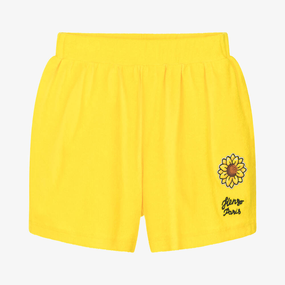 Vibrant yellow shorts for girls by KENZO KIDS, made in soft, cotton-blend terry towelling. Comfortable to wear with a stretchy waistband, they have the designer's sunflower appliqué and an embroidered logo on the front for a distinctive touch.