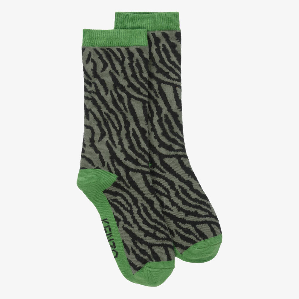 Green zebra print socks for boys and girls, by KENZO KIDS. Made in a soft and stretchy cotton blend, they have contrasting bright green trims and the brand's logo stitched underneath the foot for a logo-inspired finish. They form part of the Nigo KOTORA capsule.