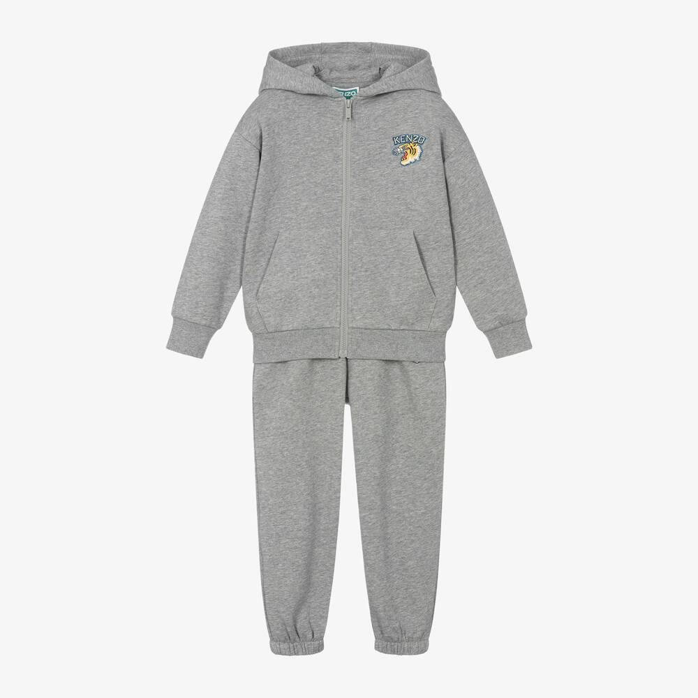 A grey marl tracksuit for boys and girls by KENZO KIDS, with the Varsity Tiger embroidered on both pieces for a bold signature look. Designed with comfort in mind, this casual ensemble is made in mid-weight cotton jersey with a soft fleecy underside. The long-sleeved top has a cosy hood, hand pockets and a branded front zip fastening. The simple, pull-on joggers have elasticated ankle cuffs and three useful pockets.