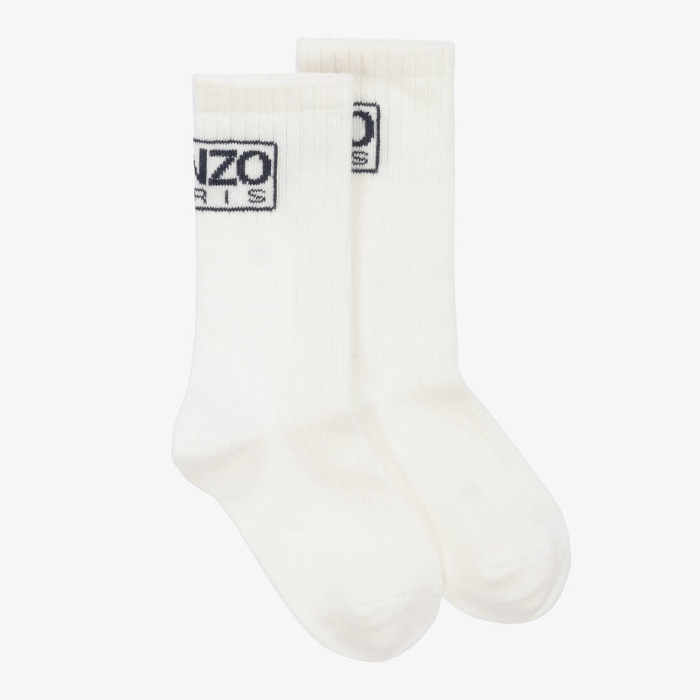 Casual ivory socks for boys and girls by KENZO KIDS, knitted in a soft and stretchy cotton blend. A distinctive everyday look, these ankle-length socks are patterned with a navy blue Kenzo Paris logo for instant recognition.