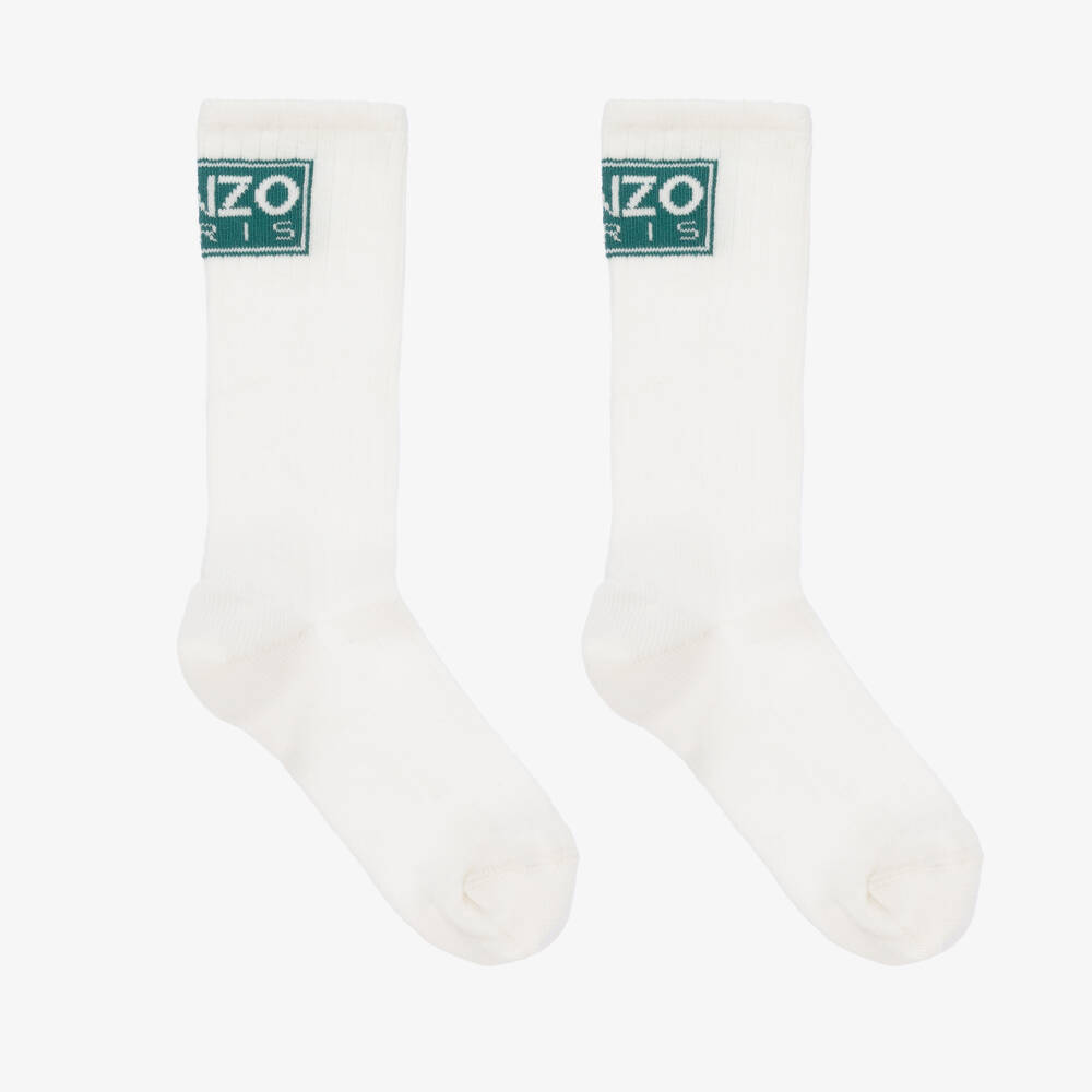 Pale ivory long socks for boys and girls by KENZO KIDS, with a green and white jacquard logo on the back. These stretchy ribbed socks are made from a soft and comfortable cotton rich blend.