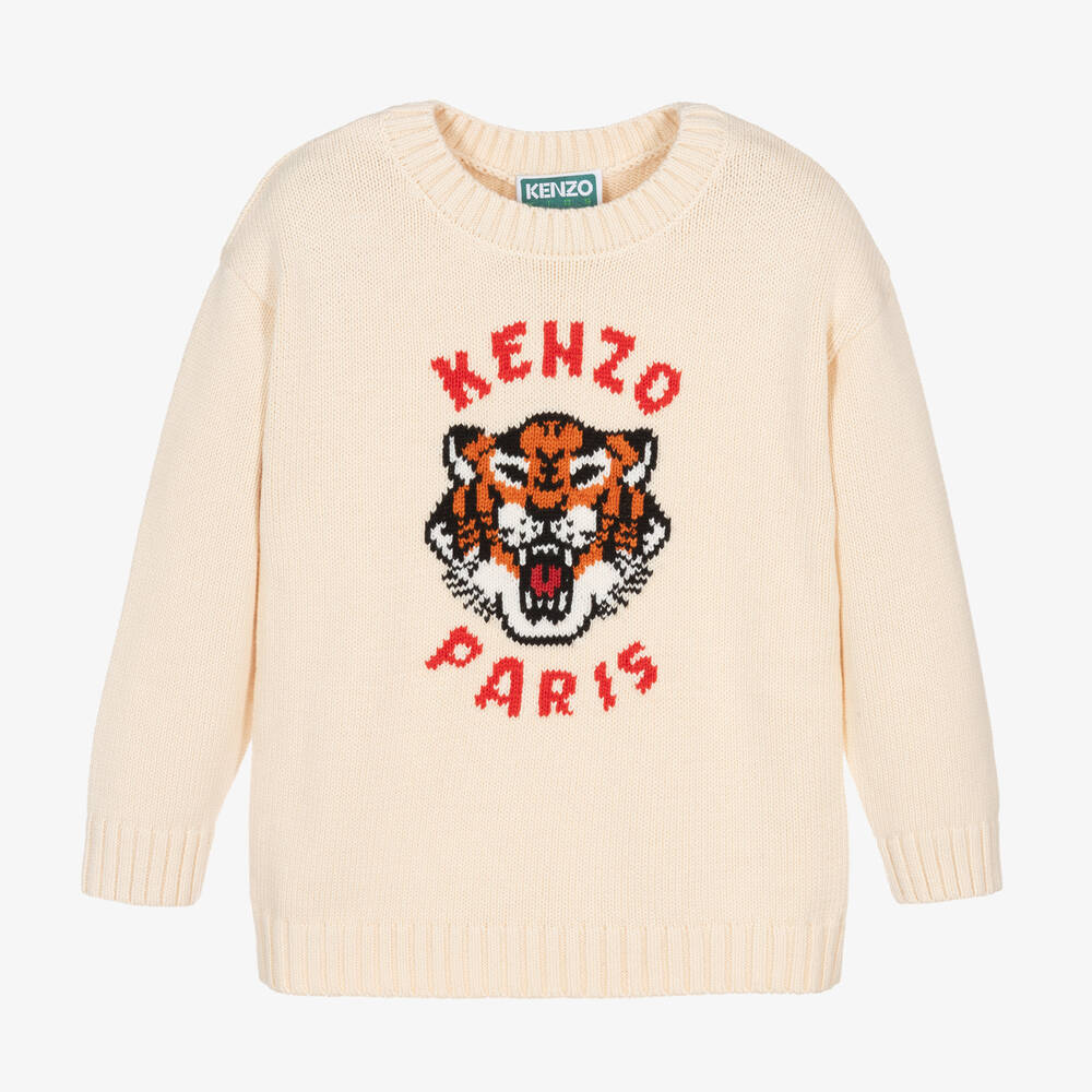 Ivory Mini-me sweater for boys and girls by KENZO KIDS, knitted in a soft cotton blend with a touch of wool for comfort and warmth. Instantly recognisable, it has a large Lucky Tiger intarsia design on the front with a red Kenzo Paris logo.