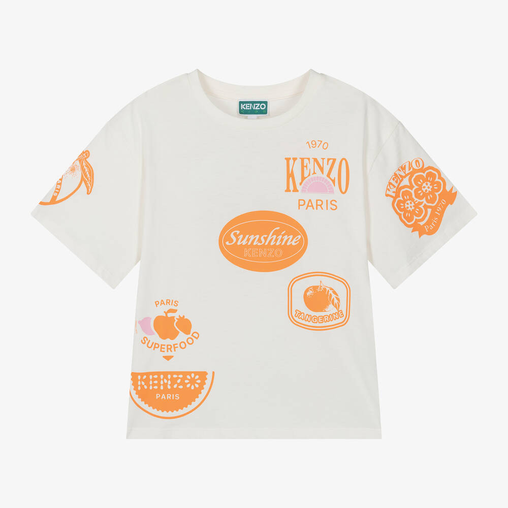 Ivory organic cotton T-shirt for girls by KENZO KIDS, with an eye-catching logo and fruit sticker print in orange. It is made in soft, comfortable jersey and has a relaxed fit.