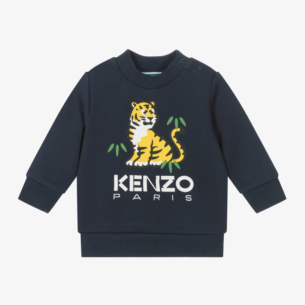 Navy blue sweatshirt for younger boys and girls by KENZO KIDS, made in mid-weight cotton jersey with a soft fleecy inside. Cute and playful in the French label's signature look, it is printed with a yellow and black KOTORA Tiger on the front and a Tiger Tail on the back. This cosy long-sleeved top has branded shoulder poppers to help with dressing.