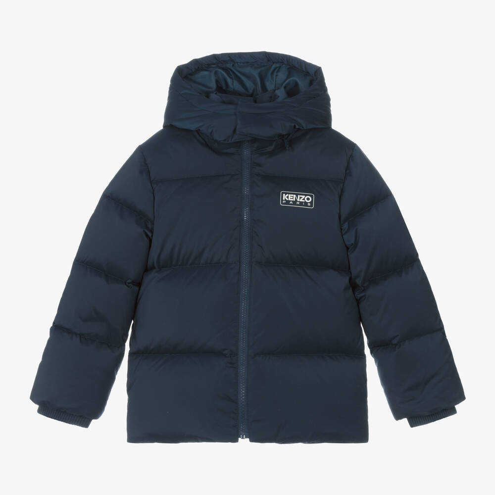 A navy blue zip-up puffer jacket for boys and girls from KENZO KIDS. Luxuriously down padded for optimum warmth, it features a water-repellent finish and has a detachable, zip-on hood with poppers to secure under the neck for extra protection against the elements. White Kenzo Paris logo prints add recognisable detail to this practical outerwear piece. It has inner ribbed cuffs and fleece-lined side pockets to keep little hands warm on the coldest of days.