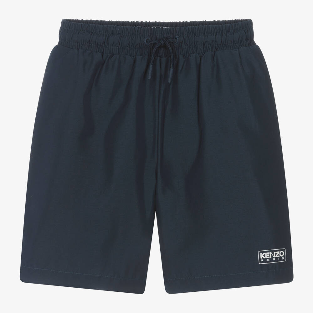 Casual navy blue Bermuda length shorts for boys and girls from KENZO KIDS. Silky smooth and lightweight with a gentle sheen, they are fully lined in soft mesh for breathable comfort. The brand's white boxed logo is printed on one leg for a designer finishing touch. Easy to pull on, they have an elasticated waistband with an adjustable drawstring and neatly concealed side seam pockets.