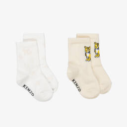 Two pairs of socks for boys and girls by KENZO KIDS, knitted in soft cotton blend. The navy blue pair are patterned with whimsical clouds with orange heels and toes and logo print for a pop of colour. The orange pair have sweet KOTORA tiger patches on the sides for a designer finish.