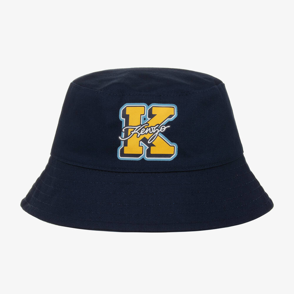 Cool navy blue bucket hat for boys and girls by KENZO KIDS. Fully reversible for switch up your child's looks, this fun accessory is made in soft cotton twill. One side is plain navy blue with a collegiate-inspired, yellow 'K' initial stamped on the front. The other side has a cartoon-inspired print for a playful twist.
