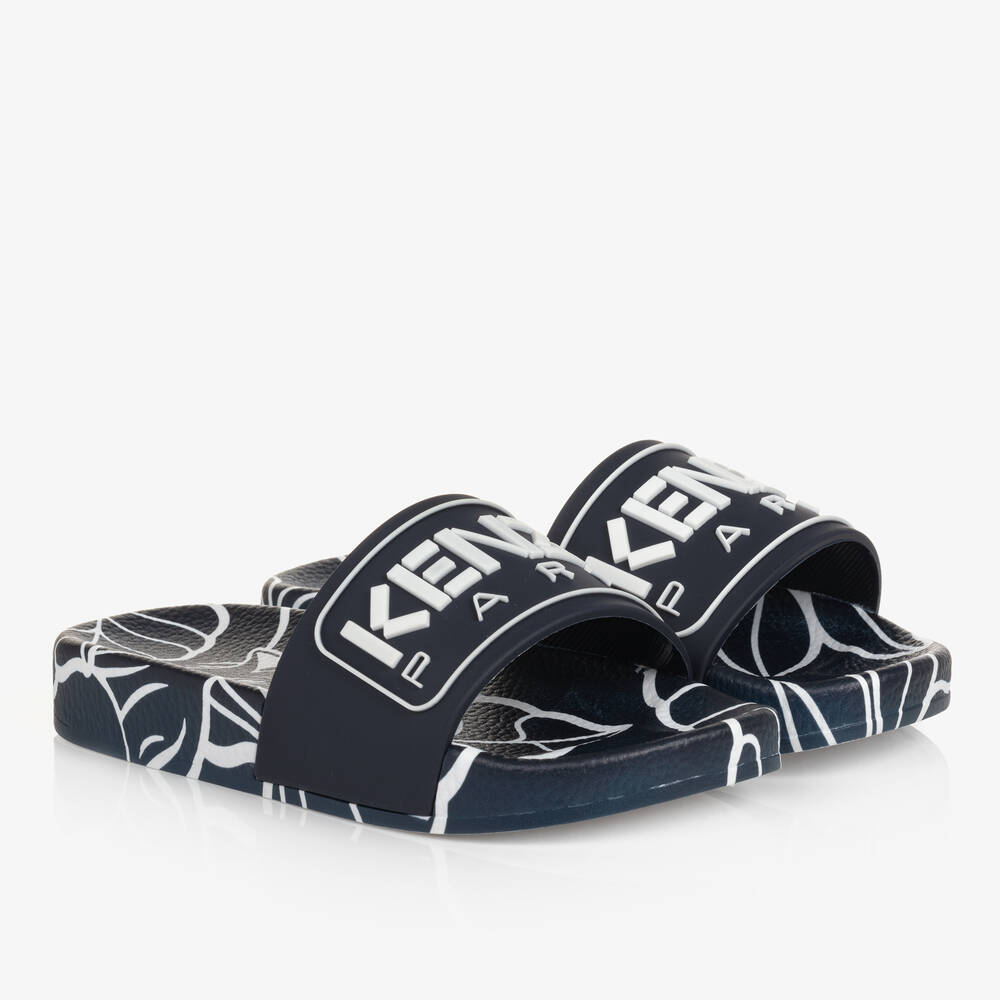 Navy blue sliders for boys and girls by KENZO KIDS. These smooth, rubberised shoes have white branding on the matte foot strap for instant designer appeal. With the Tiger on the left and Elephant on the right, the iconic animal characters on the inner soles help to encourage independent dressing. The outsoles are treaded with star-shaped grips for safety.