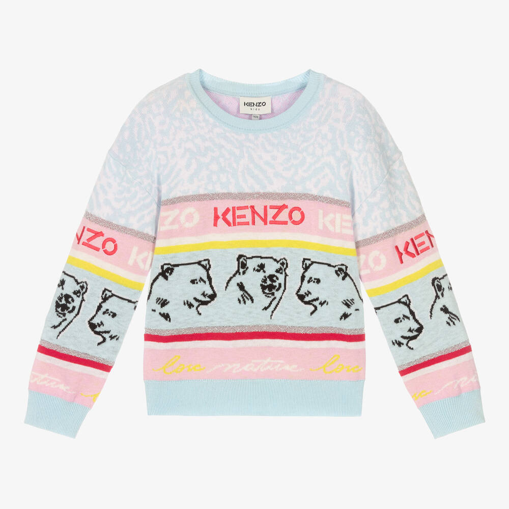 Pale blue sweater for girls by luxury French designer KENZO KIDS. It is striped in glittery silver, white, yellow and pink with embroidered logos and black bears on the front, back and sleeves.