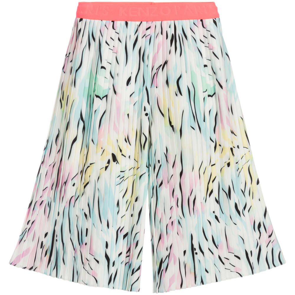Girls pleated crêpe culottes by Kenzo Kids, printed with the brand's pastel coloured Tie & Dye Stripes print on a white background. The neon pink logo waistband is elasticated for a good fit.