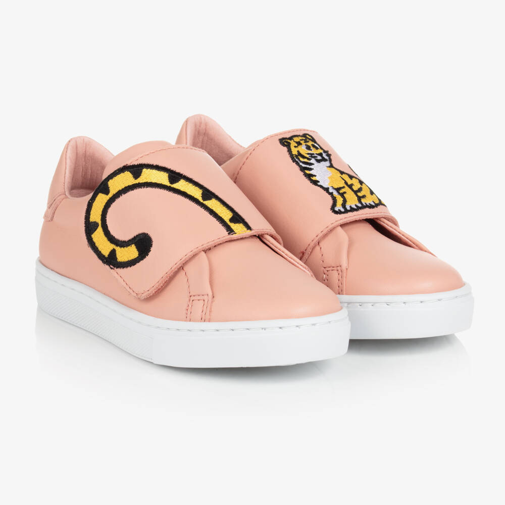 Pink leather trainers for boys and girls by KENZO KIDS, with the designer's fun embroidered KOTORA tiger and tail on the wide velcro-fastening straps. There is a black logo print on the back of the padded heel and a tonal embossed logo on the back of the non-slip rubber outer soles for added designer detailing. They have a soft lining, lightly padded inner soles for comfort and non-slip soles patterned with the brand's Tiger, Elephant and logos, as well as jungle leaves.
