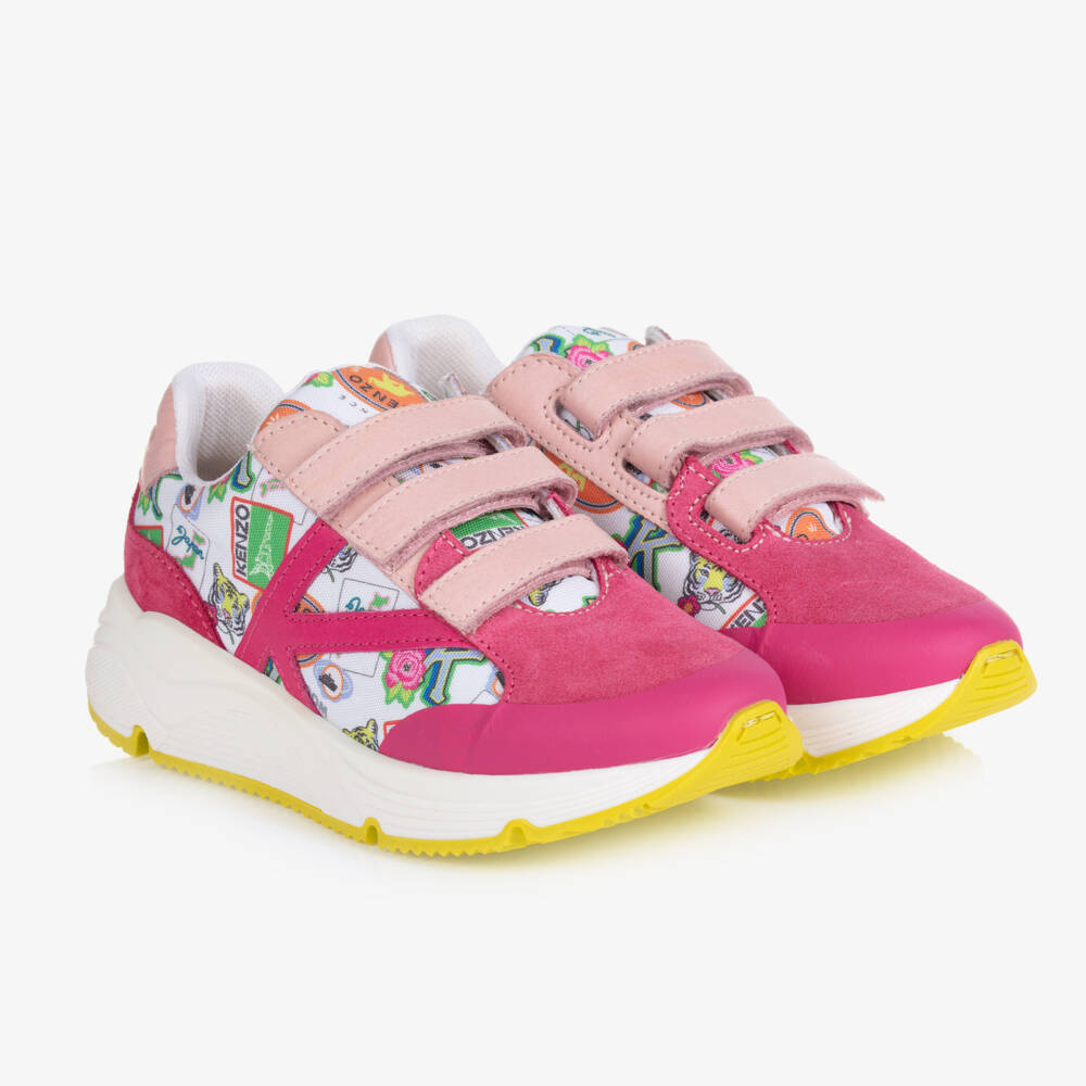 Colourful pink velcro trainers for girls by KENZO KIDS. The bold uppers comprise tonal pink panels in soft leather and suede. There are white trims on the sides patterned in travel-themed prints and an embossed logo on the heel. They are finished with a cushioned insole and a sporty non-slip rubber sole.
