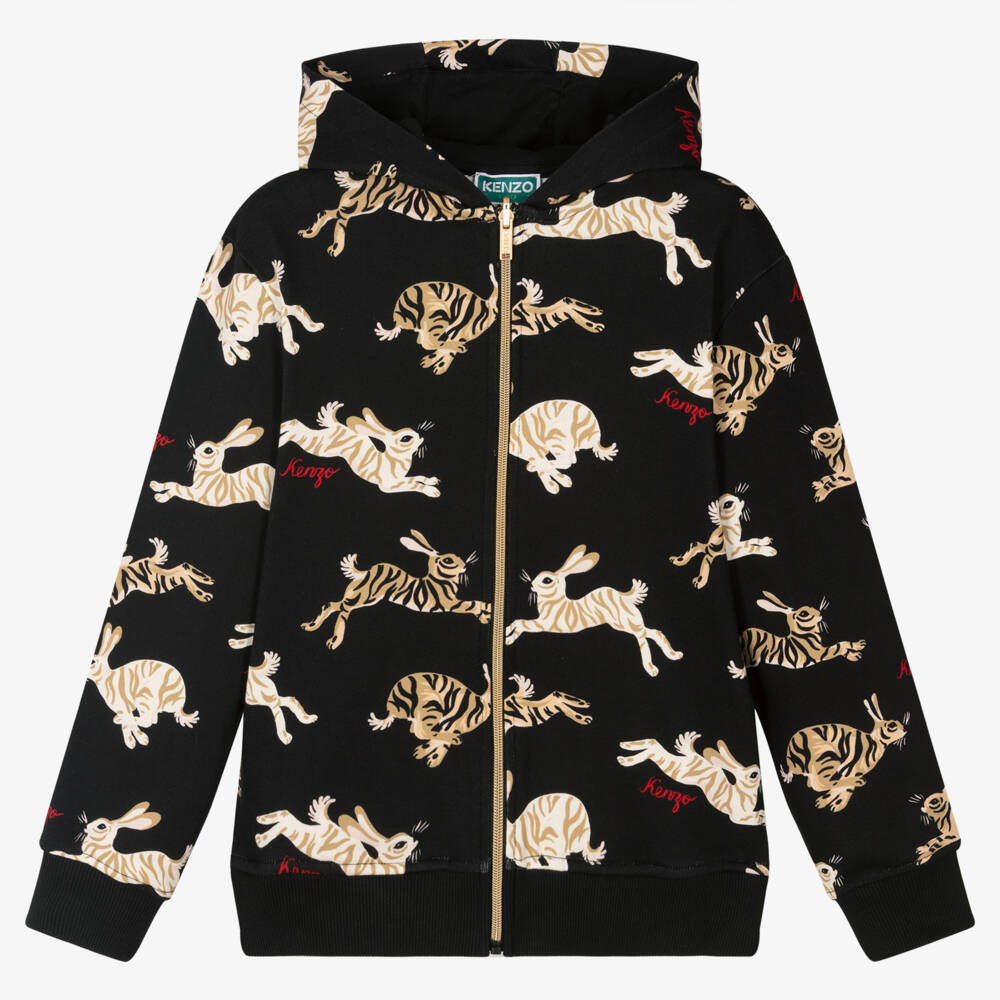 Black zip-up hooded top for teen boys by KENZO KIDS, patterned with beige, ivory and black rabbits and statement red logos. Made in mid-weight cotton jersey, it has ribbed trims for a casual look and useful side seam pockets.