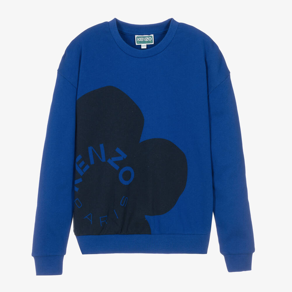 Casual royal blue sweatshirt for teen boys from KENZO KIDS. For designer appeal, it has the brand's signature Boke Flower and Kenzo Paris logo printed on the front in black. Styled with a ribbed crew neck, cuffs and hem, it is made in a comfortable mid-weight cotton jersey.