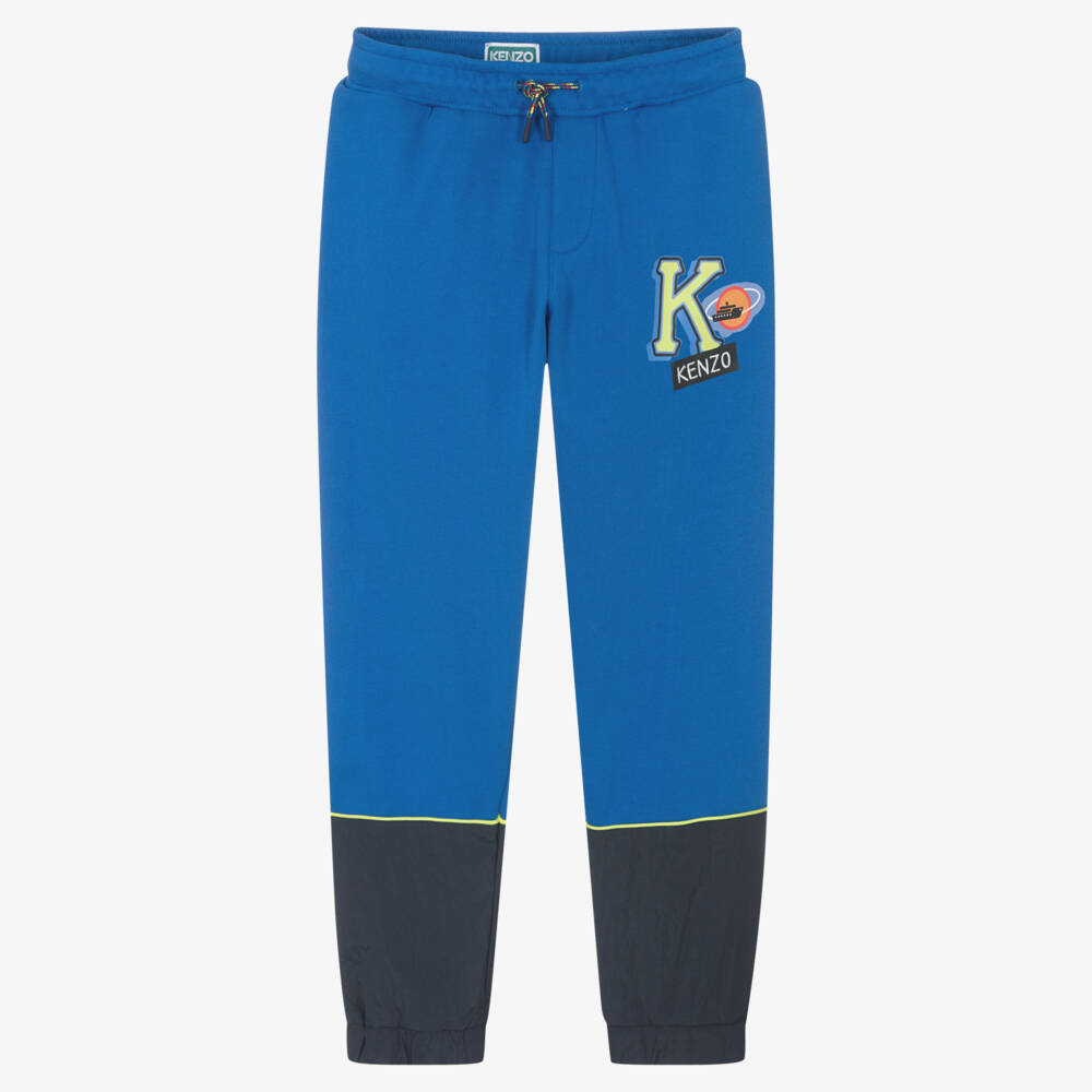 Two-tone blue joggers for teen boys by KENZO KIDS, with the brand's colourful journey-inspired graphics and logo icons on one leg. A combination of sweatshirt jersey and crinkled nylon, this sporty design has neon yellow cord trims, concealed side seam pockets and a drawstring waist. They have elasticated cuffs for a casual look.