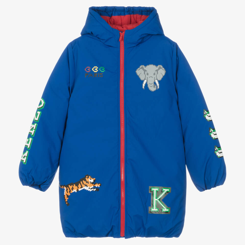 Bright blue puffer coat for teen boys by KENZO KIDS, complete with pixelated jungle animals and logo motifs. Forming part of the Jungle Game collection, this signature piece has the French brand's iconic Elephant printed on the back in yellow for unmissable, stand-out style. Padded for warmth, it has elasticated trims, handy side seam pockets and a contrast red zip front. The silky smooth fabric is treated, making it resistant to water on rainy days.