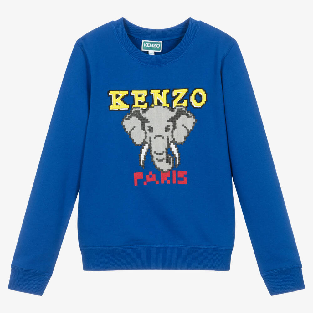 Royal blue sweatshirt for teen boys by KENZO KIDS. The brand's iconic Elephant is on the front in a fun pixelated design, with a colourful 3D embroidered logo making a bold designer statement. This comfortable top is made in a soft cotton-blend jersey with a fleecy inside and has a casual crew neck and stretchy ribbed trims.