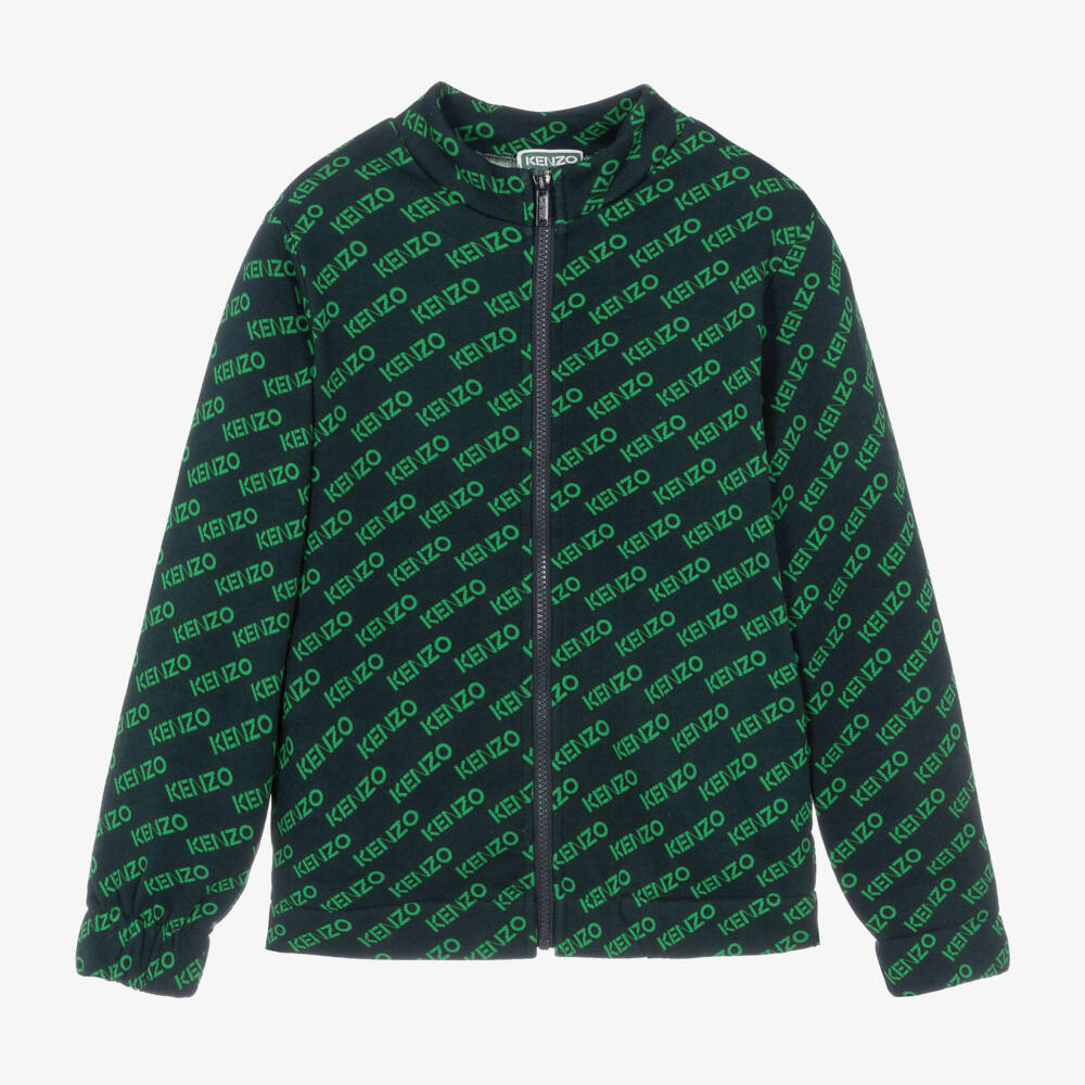 Navy blue zip-up top for teen boys by KENZO KIDS, patterned with vibrant green logos for unmissable style. A casual silhouette, it has an elasticated hem, a branded zip pull and hidden side seam pockets for everyday essentials. A great choice for relaxed days, it is made in mid-weight cotton jersey with a cosy brushed feel inside.